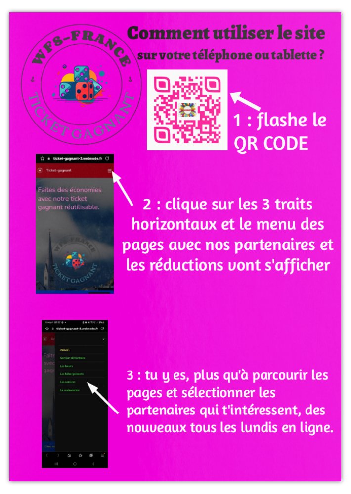 WFS France est une équipe passionnée qui a lancé le "Ticket Gagnant" en collaboration avec les acteurs locaux de chaque ville partenaire, une initiative novatrice pour vous permettre de vivre une aventure exceptionnelle avec vos commerçants en les rencontrant autrement. En collaborant avec divers partenaires, vous offrez des remises aux clients, ce qui vous permet de gagner des bons d'achats chez des commerçants et des entrées pour les sites de loisirs et touristiques de la région. C'est une belle façon de créer des liens authentiques entre vous et les commerçants, tout en rendant la visite de la ville plus ludique et excitante grâce à des jeux "escape games". Si vous avez des questions ou si vous souhaitez en savoir plus sur ces activités, n'hésitez pas à demander ! Les commerçants sont là pour vous aider.